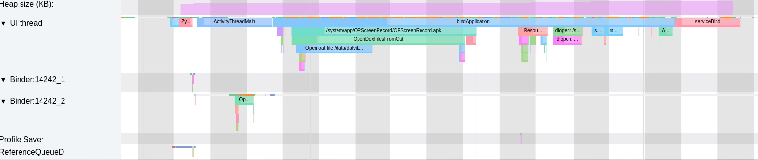 Below is a trace of an app’s cold start under low memory, from bindApplication to the first frame (total 2s).