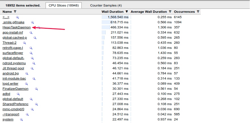 Looking at CPU usage during this period, besides HeapTaskDaemon running more frequently, very few other memory and I/O related processes are active.
