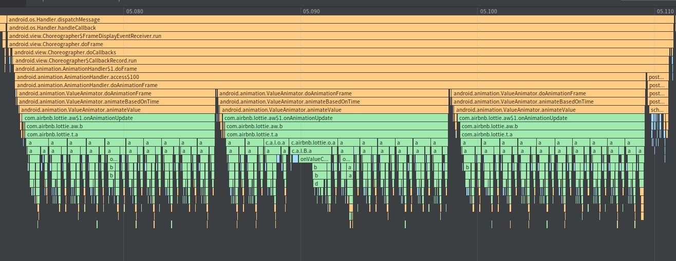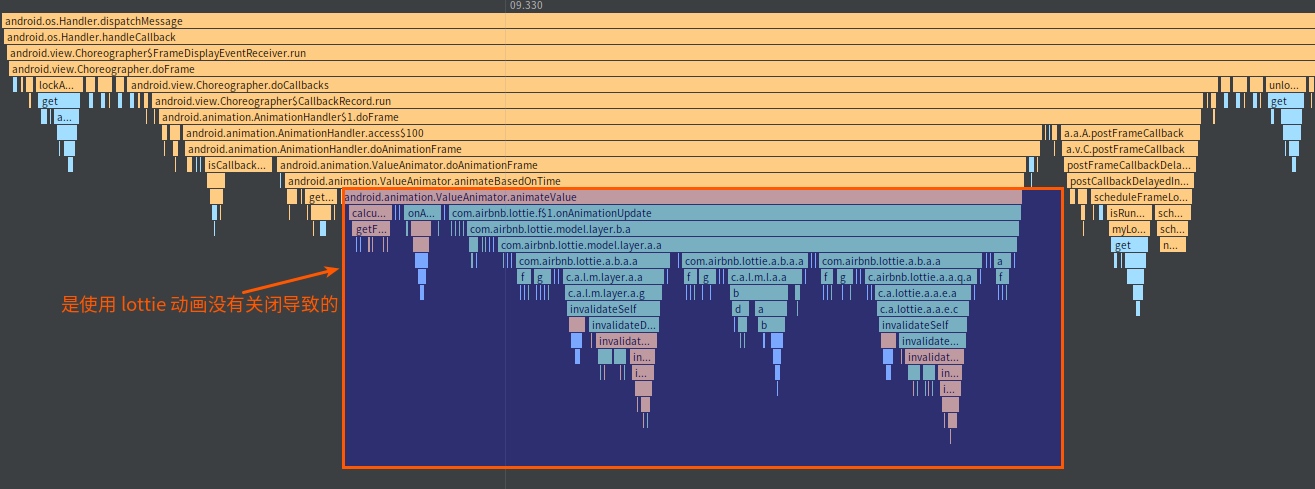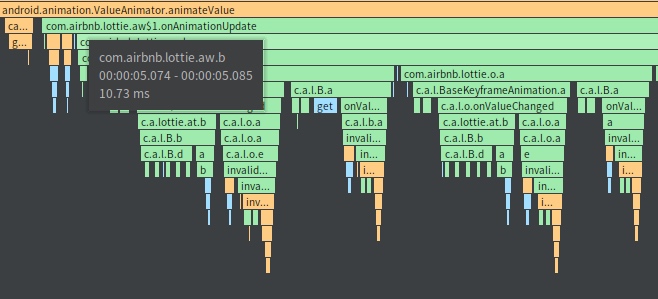 Further inspection using Method Trace reveals that the issue stems from the Lottie animation library by Airbnb. The animation was set to loop but was never paused when the view became invisible, causing it to trigger onAnimationUpdate indefinitely.