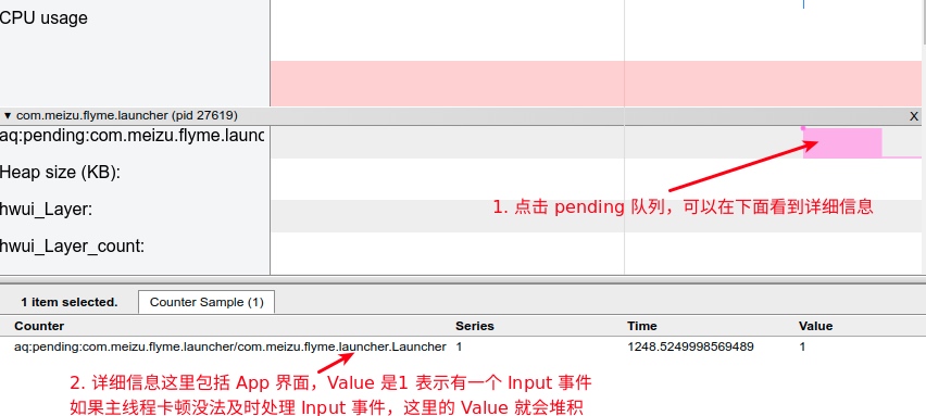 InputReader: Reads Input events fromEventHuband passes them toInputDispatcher.InputDispatcher: Processes events received fromInputReader(packaging and dispatching them to the corresponding app).OutboundQueue: Contains events about to be dispatched to the correspondingAppConnection.WaitQueue: Records events dispatched to anAppConnectionthat the App has not yet acknowledged as successfully processed.PendingInputEventQueue: Records Input events that the App needs to process (now within the application process).deliverInputEvent: Marks the App UI Thread being woken up by an Input event.InputResponse: Marks the Input event region, covering the processing stages ofInput_Down,Input_Move(multiple), andInput_Up.- App Response to Input Event: This shows the scrolling and subsequent release (fling) actions. Launcher updates the screen as the finger moves and triggers Fling after release; the entire flow is visible in Systrace.