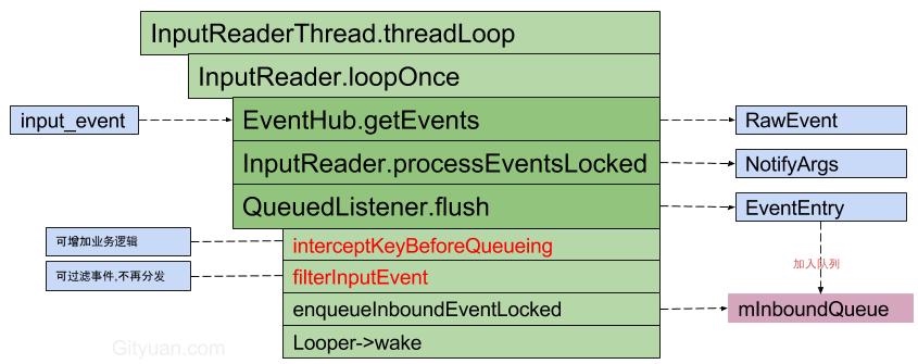 getEvents: Reads events fromEventHub(monitoring/dev/input), places them intomEventBuffer(size 256), and convertsinput_eventtoRawEvent.processEventsLocked: Processes events, convertingRawEvent->NotifyKeyArgs(or otherNotifyArgs).QueuedListener->flush: Sends events to theInputDispatcherthread, convertingNotifyKeyArgs->KeyEntry(orEventEntry).