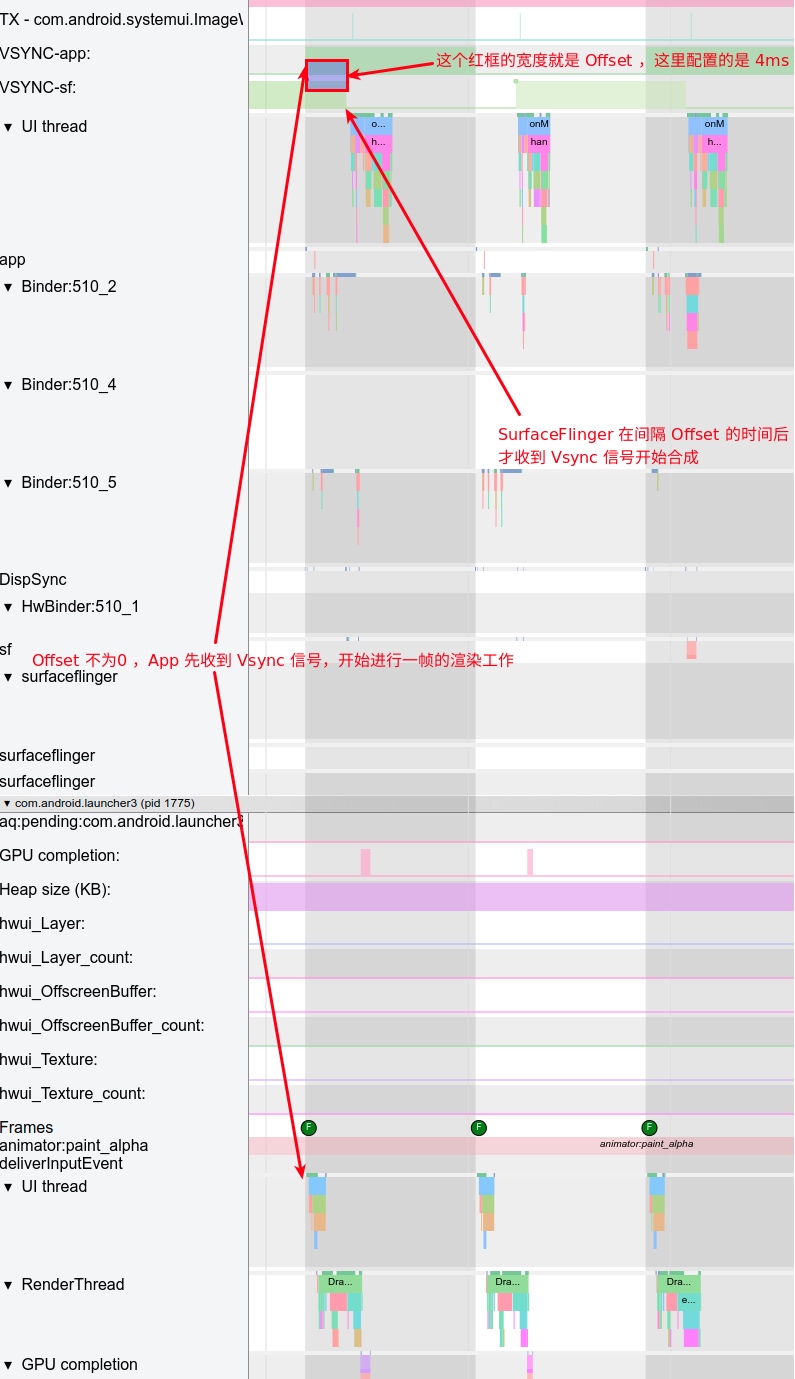 Below is an example with a 4ms Offset: SurfaceFlinger receives Vsync 4ms after the App does.