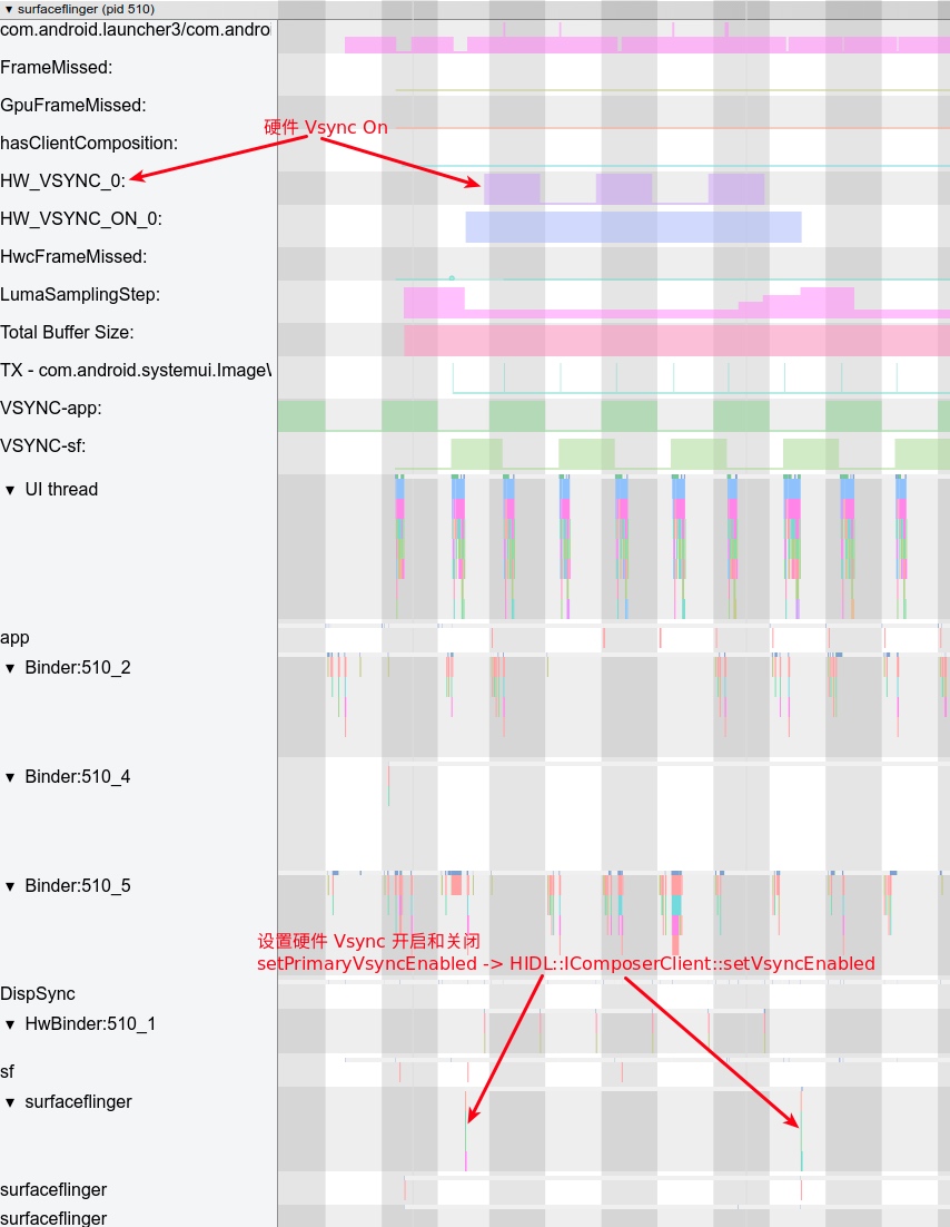 Using Launcher scrolling as an example, you can see the HW_VSYNC state in the SurfaceFlinger process trace.