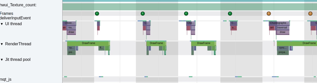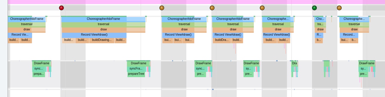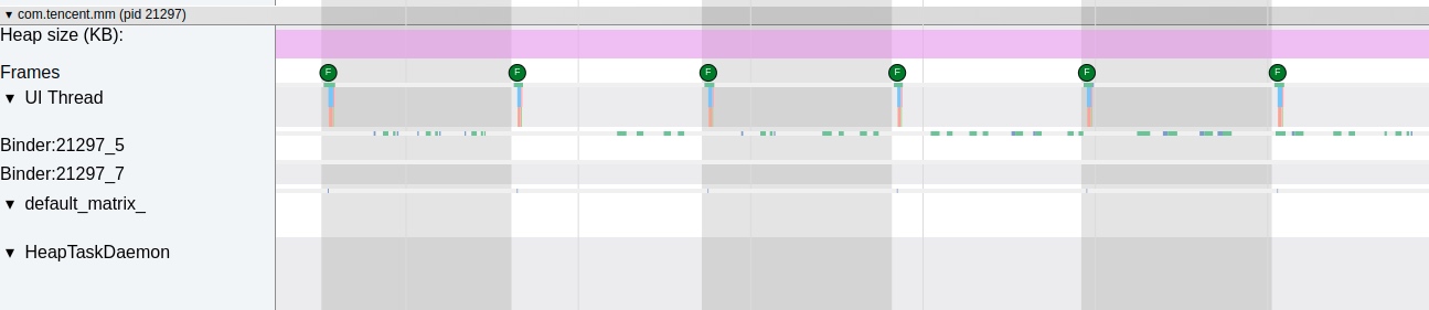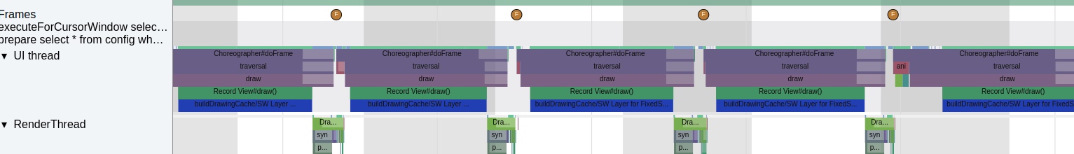 应用本身频繁调用 buildDrawingCache 会导致主线程执行耗时从而导致卡顿 , 从下图来看, 主线程每一帧明显超过了 Vsync 周期
