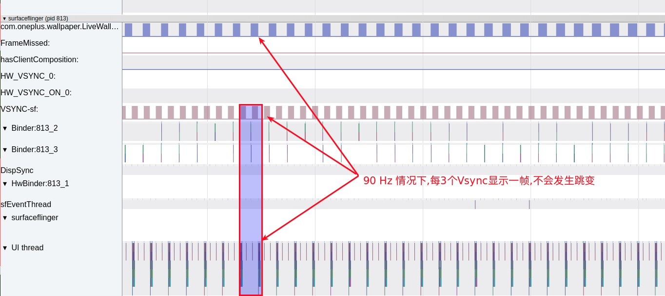 这一项指的是游戏自身的绘制问题, 会导致总是不能满帧去跑, 如下图, 红框部分是SurfaceFlinger 显示掉帧, 原因是底下的游戏在绘制的时候, 刚好这一帧超过了 Vsync SF 的信号.这种一般是游戏自身的问题.