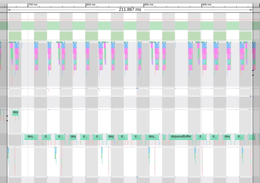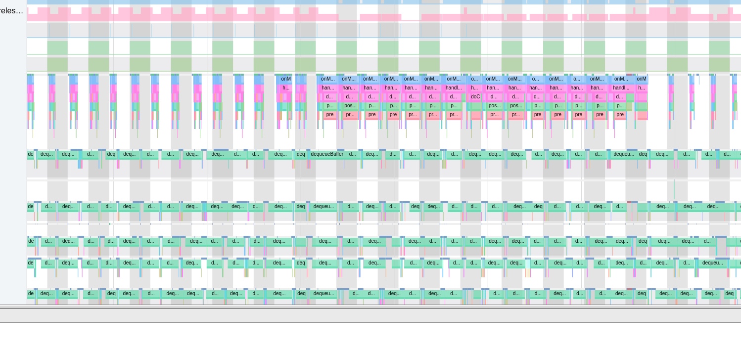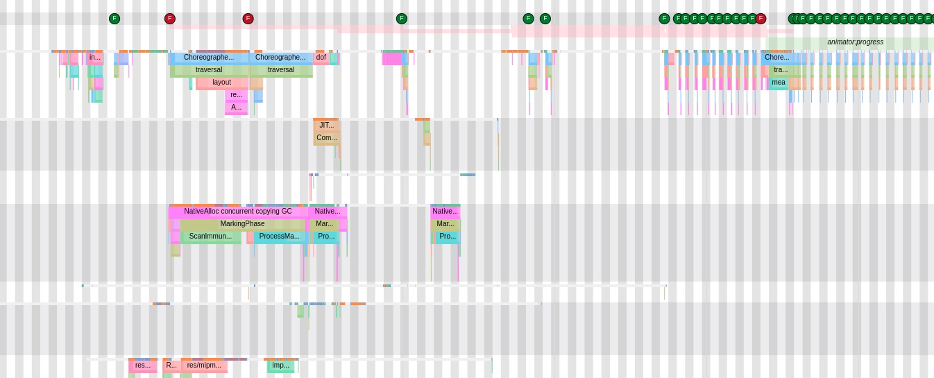 如下图 , 这是一个连续滑动的 Systrace 图 , 最下面两行是 InputReader 和 InputDispatcher , 可以看到在滑动的过程中, InputReader 和 InputDispatcher 没有读出来 Input 事件, 导致卡顿