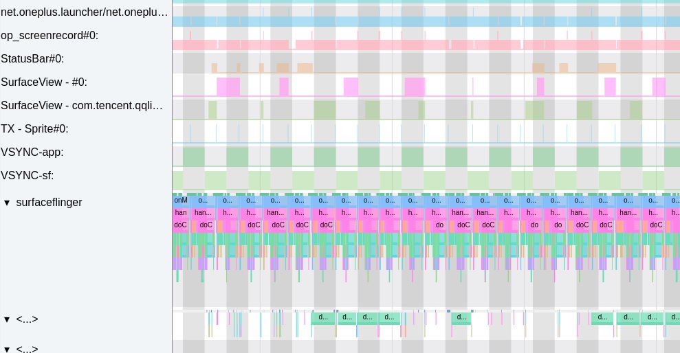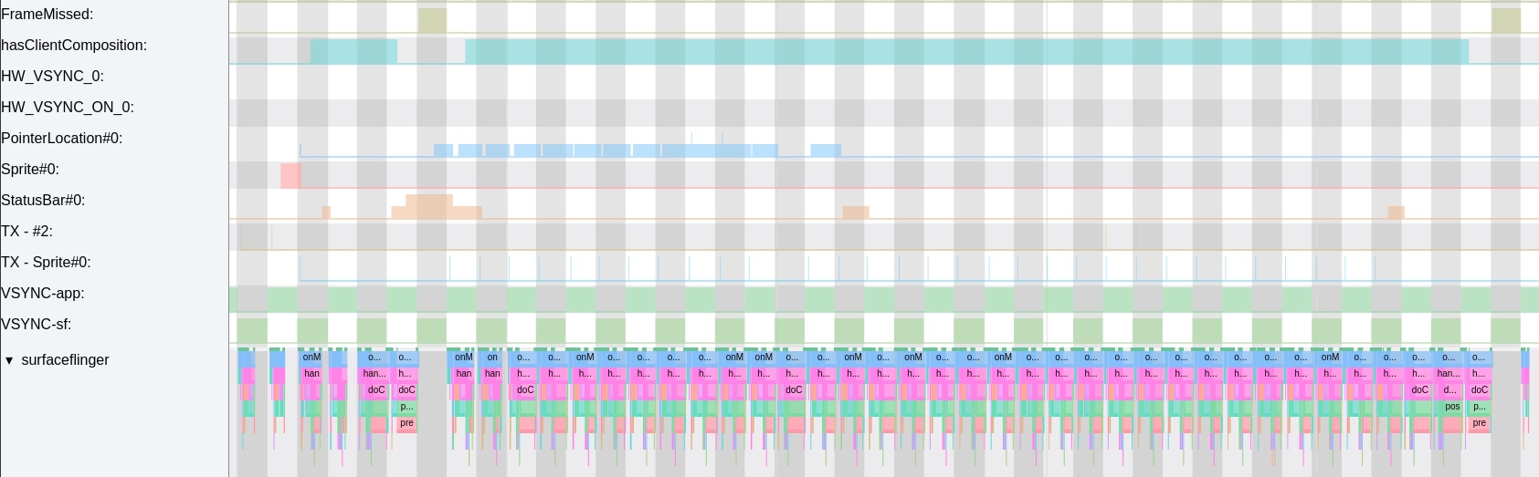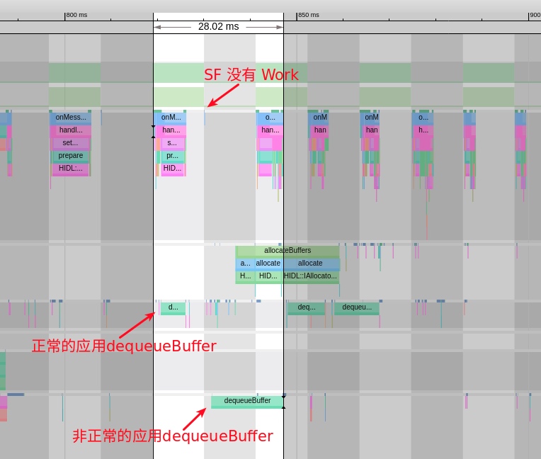 如下图 , 可以明显看到 SurfaceFlinger 的 VSYNC-sf 这一行间隔是不一样的. 这种问题一般是由于 SurfaceFlinger 这边的修改或者 HWC 的修改导致的 .