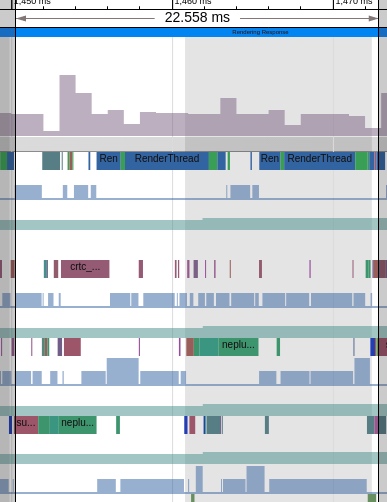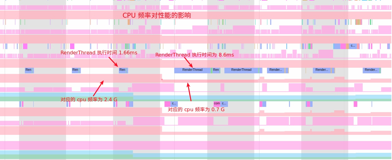 如下图 , RenderThread 跑到了小核, 导致这一帧执行时间过长,造成卡顿图片: