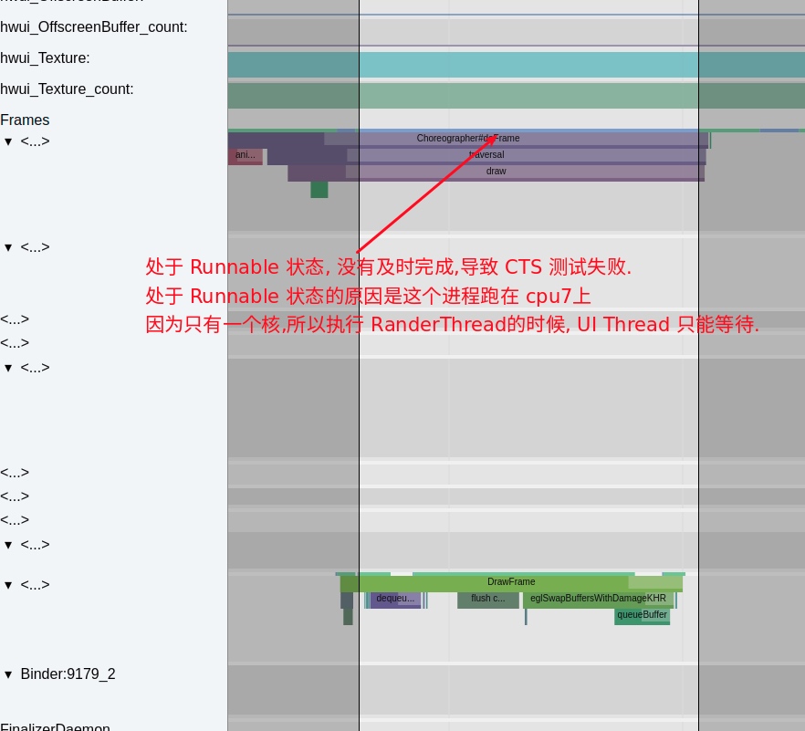 如下图, 这是一个 CTS 问题, CTS 主线程由于被绑定到了 cpu7 , 由于 cpu7 在执行 RenderThread , 所以主线程没有调度到, 导致 CTS 失败