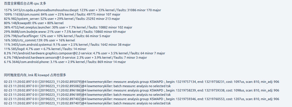 - CPU 资源 : 由于 LMK 杀掉的进程通常都是一些 Cache 或者 Service , 这些进程由于低内存被杀之后 , 通常会很快就被其主进程拉起来, 然后又被 LMK 杀掉, 从而进入了一种循环. 由于起进程是一件很消耗 cpu 的操作, 所以如果后台一直有进程被杀和重启, 那么前台的进程很容易出现卡顿