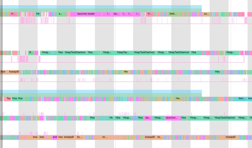 原因同上 , 当后台任务过多的时候 , cpu 资源就会异常紧缺 , 如下图就是在系统低内存的时候 , HeapTask 和 kswapD 几乎占满了整个 cpu , 在疯狂地向系统申请内存 .