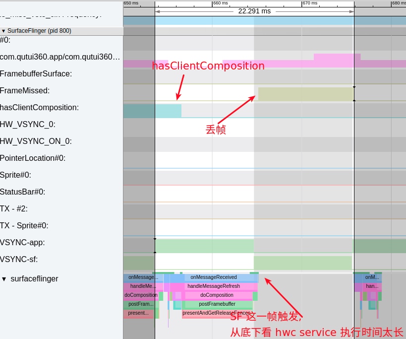 SurfaceFlinger 负责 Surface 的合成 , 一旦 SurfaceFlinger 主线程调用超时 , 就会产生掉帧 .