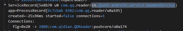当然从 Event Log 里面我们看不出来是谁拉起了这个 Service ,这时候就需要 dumpsys activity 的帮助了, 由于是 Service 组件被拉起, 那么我们可以看 com.qq.reader 的 ServiceRecord , 其内容如下, 可以看到其 Connections 一栏, 是被 com.qidian.QDReader:pushcore 这个进程拉起的