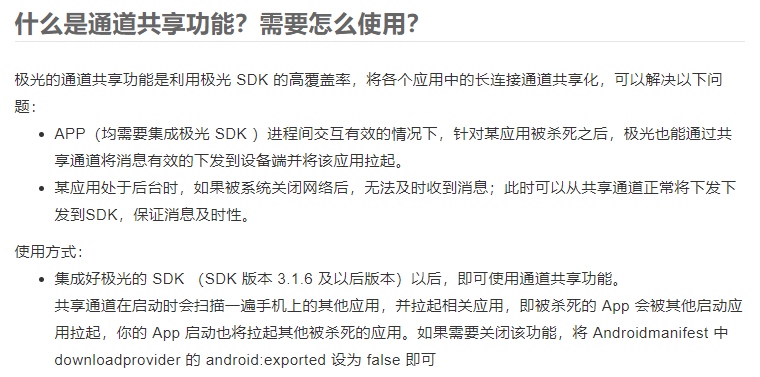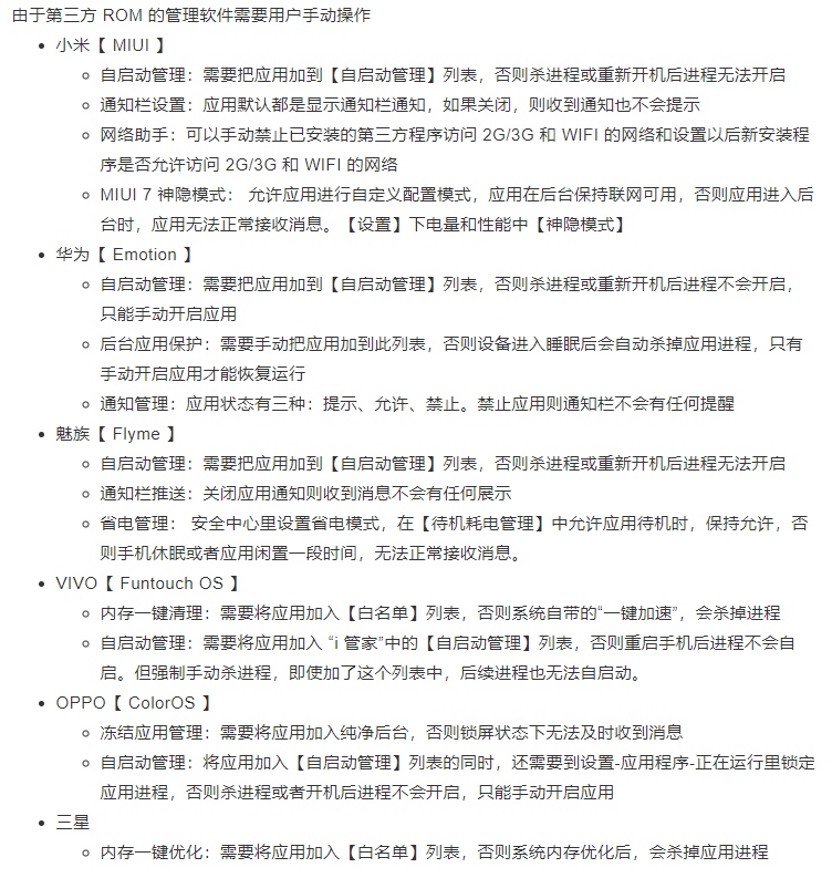 我们从极光和个推的官方文档就可以看到各个手机厂商的应对方法和开关的界面, 这里列出来是方便大家进去看一下, 因为各个手机厂商的白名单配置不一样, 或者有时候用户自己改过但是忘记了 , 都可以进去重新设置一下 , 对于那些你退出了就不想让他继续活动的应用 ,果断去掉白名单.