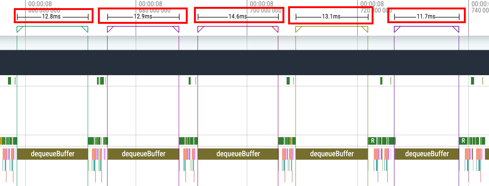 App 的 Buffer 消费者是 SurfaceFlinger,通过 App Process 这边的 Actual Timeline 这行,我们可以看到 Buffer 具体是被 SurfaceFlinger 的哪一框消费了。
