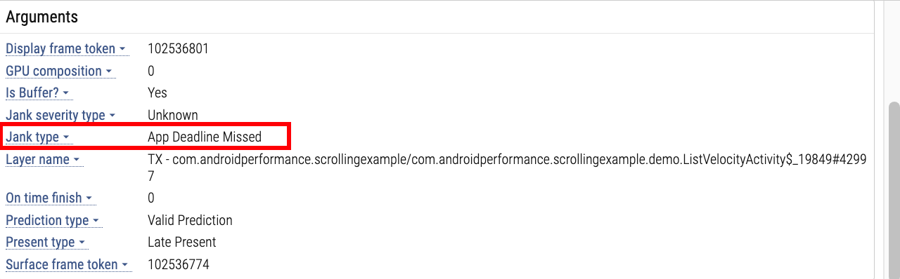 点击 Actial Timeline 红色那一段,底下的信息栏会显示掉帧原因: