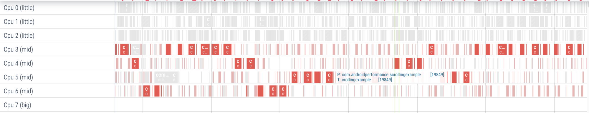 在 CPU Info 区域,鼠标放到某一个 Task 上,就会这个 Task 对应的 Thread 的其他 Task 都会高亮。
