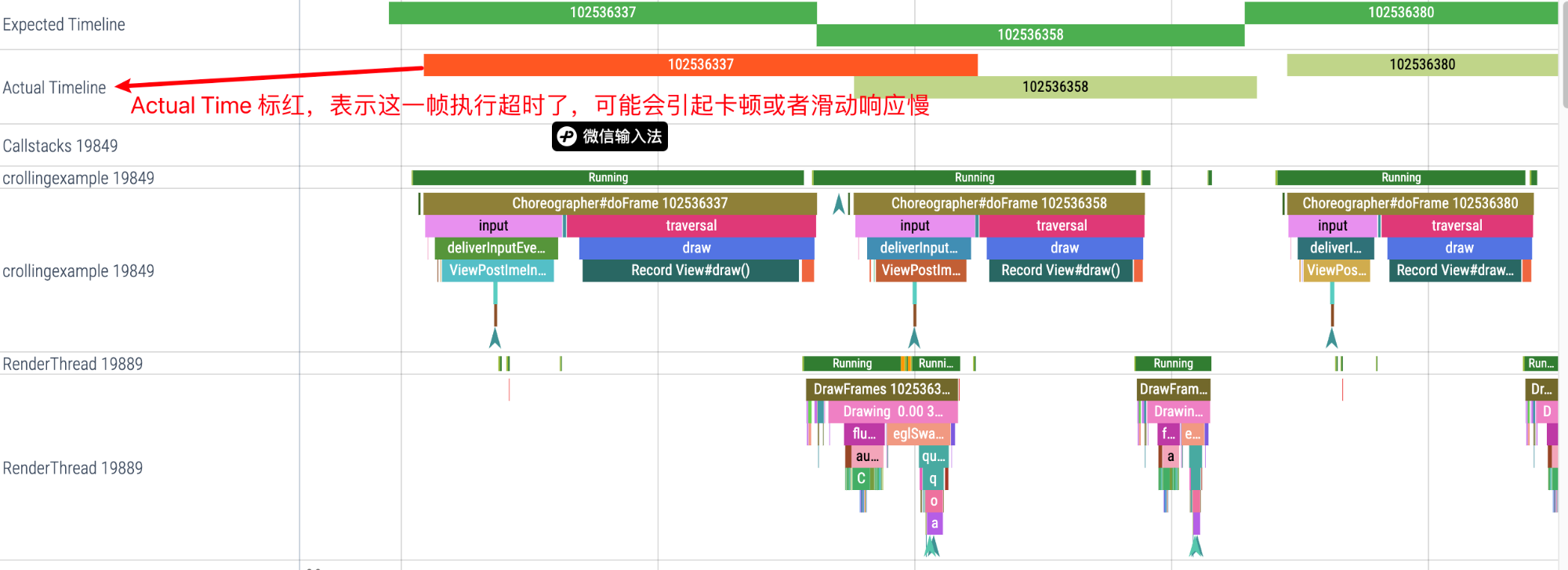 通过 Perfetto 提供给的 Expected Timeline 和 Actual Timeline 这两行,可以清楚看到执行超时的地方。