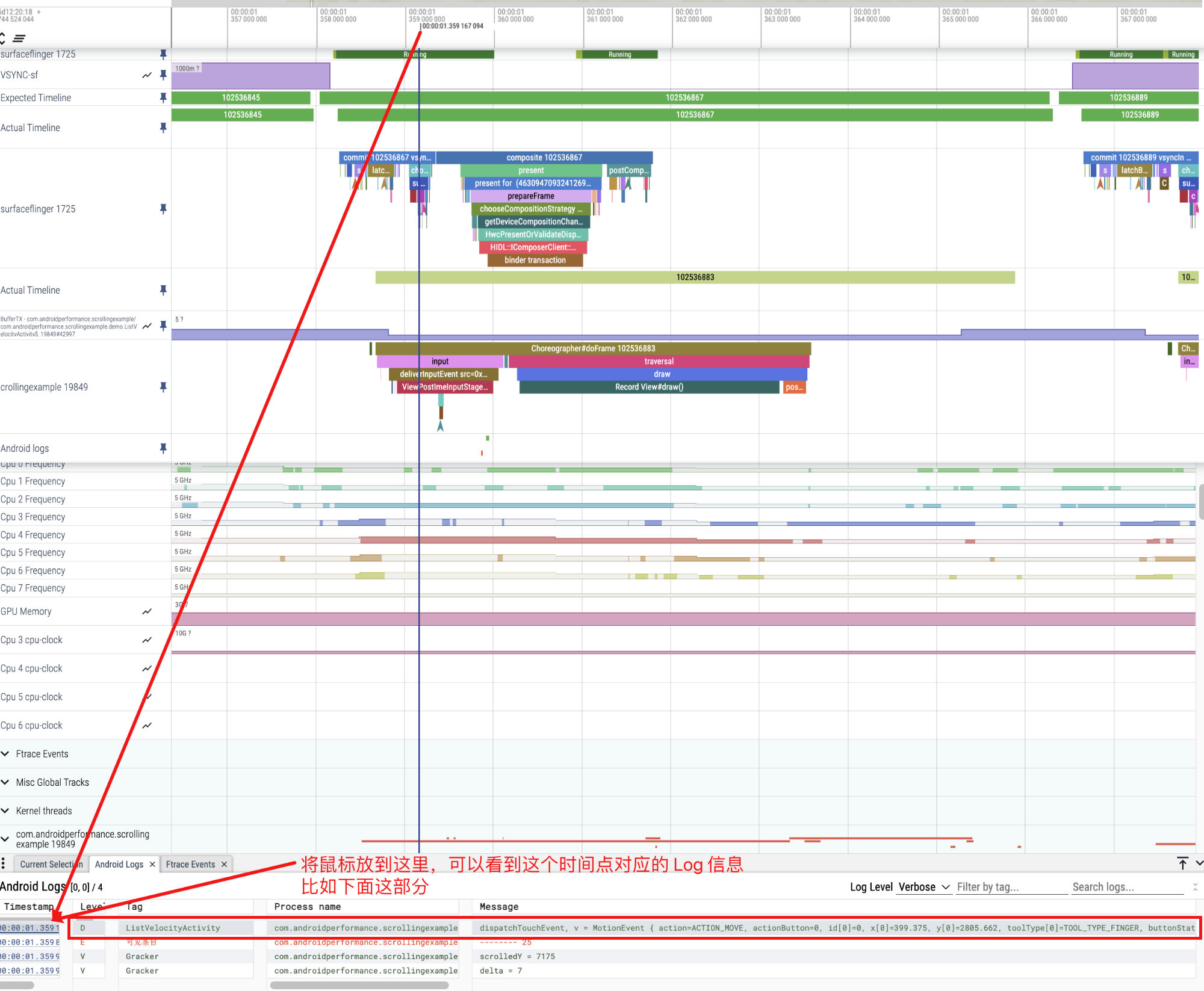 在信息栏上切换到 Android Logs 这个 Tab,鼠标放倒某一行上,Perfetto 就会把对应的 Timeline 拉一条直线,可以看到这个 Log 所对应的时间