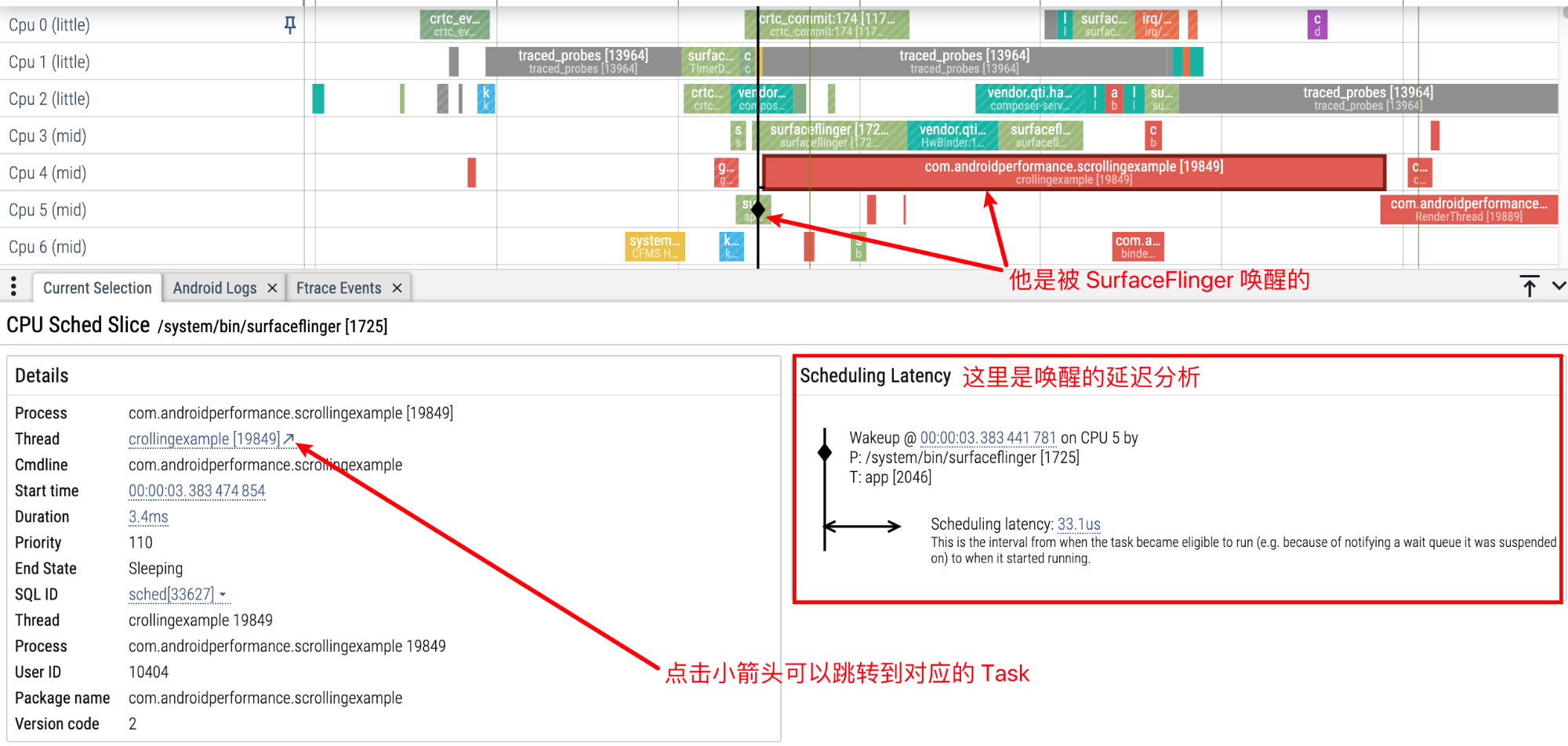 我们可以通过查看某一个 Task 的唤醒源,来了解 App 和 Framework 的运转流程,Systrace 和 Perfetto 都可以查看唤醒源,不过 Perfetto 在这方面做的更丝滑一些。
