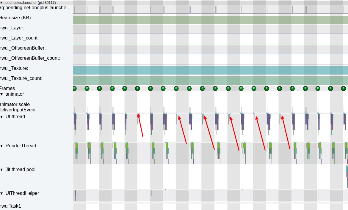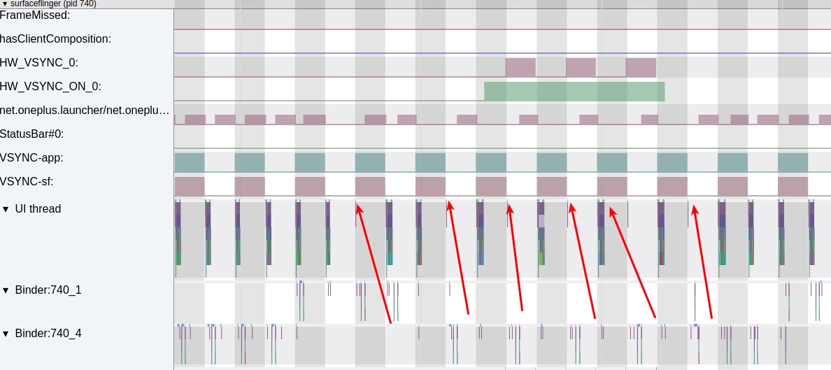 The red arrow indicates where the frame drop occurred. From the Buffer count above, it can be seen that the reason SF did not draw is that Launcher did not submit a Buffer.