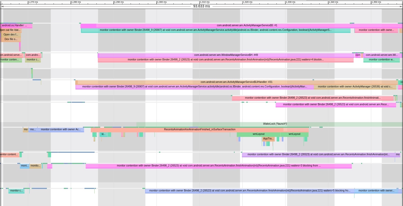 - Reduce system calls during startup, avoiding lock competition with AMS and WMS. During startup, AMS and WMS already handle much work, and many AMS/WMS operations are locked. If the app makes excessive Binder calls to communicate with AMS/WMS, SystemServer experiences大量锁等待 (significant lock waits), blocking critical operations.