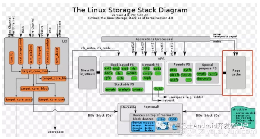 Between the底层文件系统 (underlying filesystem) VFS and app processes lies a pagecache layer composed of physical pages in memory, whose content corresponds to blocks on disk. Pagecache size changes dynamically—it can expand or shrink under memory pressure. Cached storage devices are called backing store. A page typically contains multiple blocks, which aren’t necessarily contiguous.