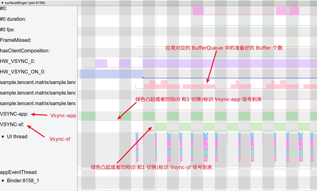 The diagram below shows VSYNC_APP and VSYNC_SF within the SurfaceFlinger process in Systrace.