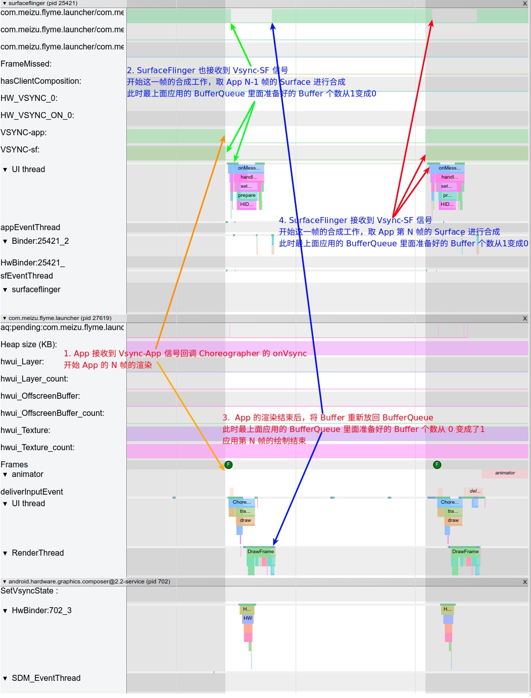 SurfaceFlingerand App receive it simultaneously. SurfaceFlingerreceivesVsync-sfand begins compositing the App’s previous frame buffer.- App receives