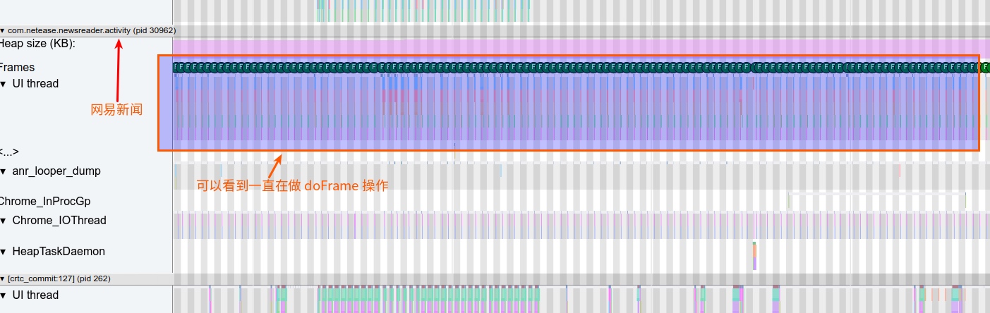 In Perfetto UI, you can find the event named “Choreographer#doFrame”, which shows the processing time and details of each frame. You can also check the collaboration relationship between the UI thread and RenderThread, and the interaction with SurfaceFlinger.